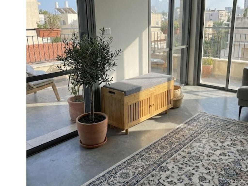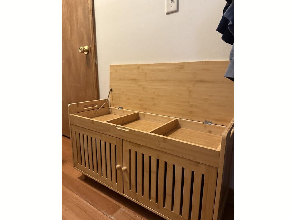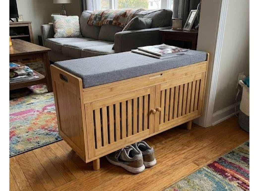 דירה תל אביבית טיפוסית, אין מקום לכלום. הדבר הזה הציל אותנו. גם ספסל וגם ארון נעליים במוצר אחד. גאוני. הגימור של העץ יפה מאוד.